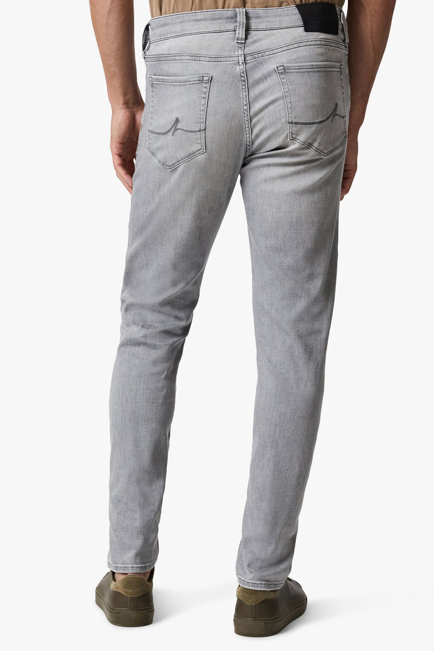 An edgy grey wash redefines luxury denim. This pair is designed with a mid rise and carefully tailored slim leg that tapers below the knee. Tonal stitching and a 5-pocket construction are details that complete the look. By 34 Heritage.Â