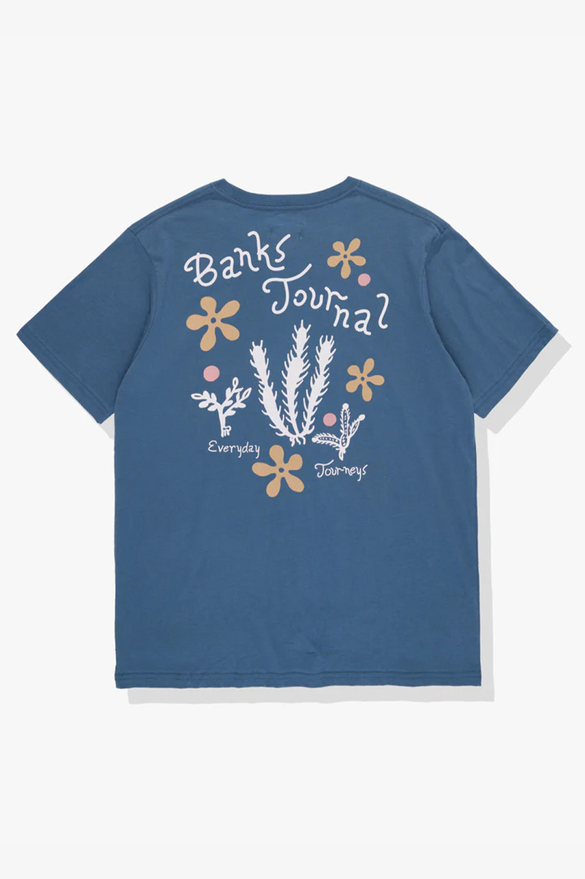 Jersey crew neck with bio enzyme wash, Chest and back print, Back neck and shoulder seam cover stitch, Recycled polyester woven labels, FSC® approved paper swing tags. By Banks Journal.