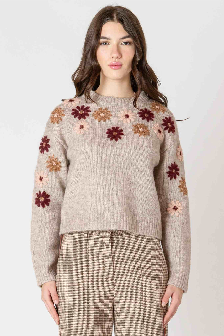 Wrap yourself in whimsy with the Dex Black Tape Floral Applique Crew Sweater. This cozy long-sleeve piece features charming floral appliques that add a touch of fun and flair to the classic crew neck silhouette. Perfect for days when you want to blend comfort with a splash of playful style. By Black Tape.Â