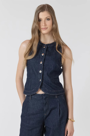 This timeless denim vest is designed to be suitable for both elevated looks and casual days. Made to have a structured fit, with the classic button-front design, this denim vest can be a layering item or a statement piece. Pair with jeans to achieve the denim on denim look we all love. By Black Tape.