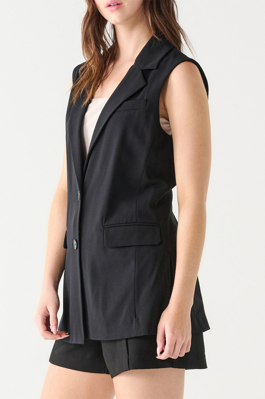 This single breasted sleeveless blazer from Black Tape is a must-have staple piece. Featuring two front pockets, notched lapels, and side slit detailing. Layer with your favorite tanks and tees to easily dress up any look! By Black Tape.Â