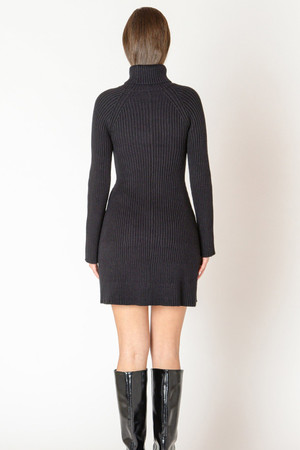 A true staple, a classic sweater dress. This dress features a flattering ribbed fabric, mid length, folded turtleneck, soft bell sleeves and a shaped silhouette. By Black Tape.