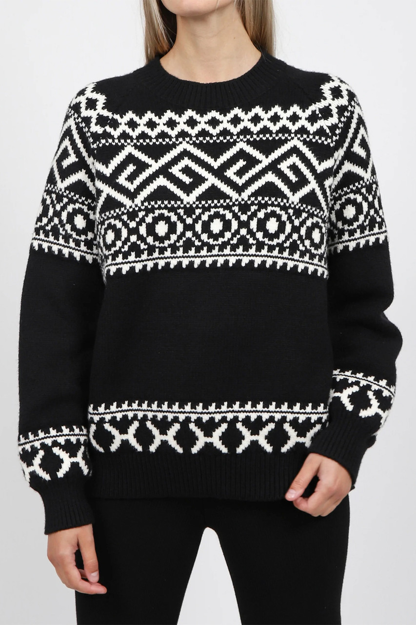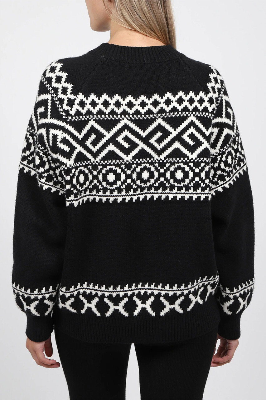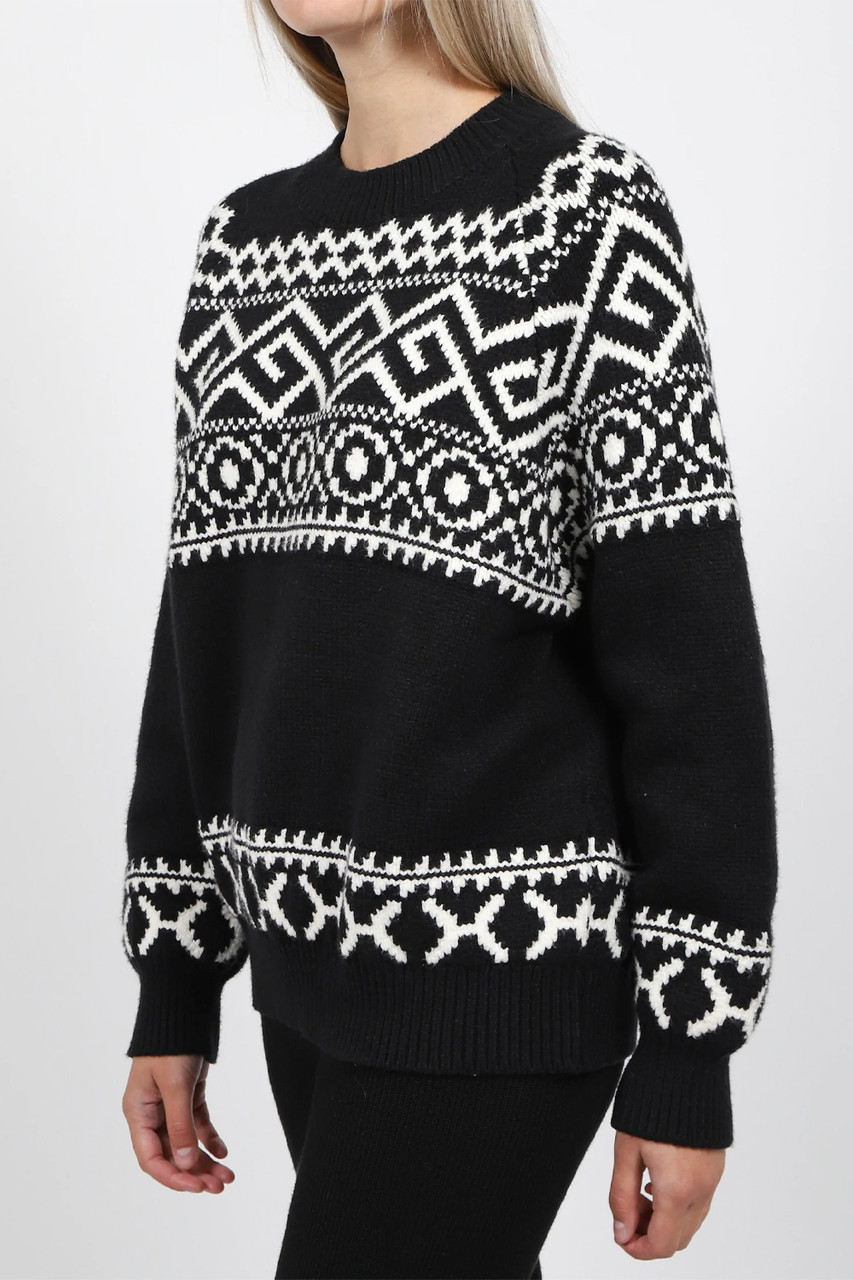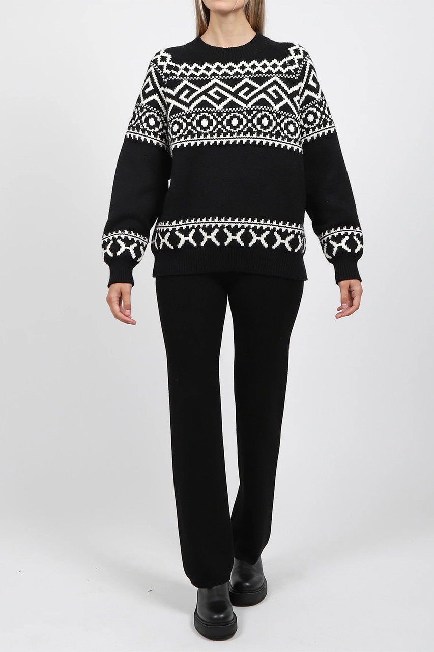 Our chunky Fair Isle Sweater will take you from day to après ski. Available in Black with a festive Cream pattern across the body and arms. Inspired by our NYBF’s Crew, this Knit Sweater features a wide body with a slouchy, oversized fit and a drop shoulder. By Brunette the Label.Â
