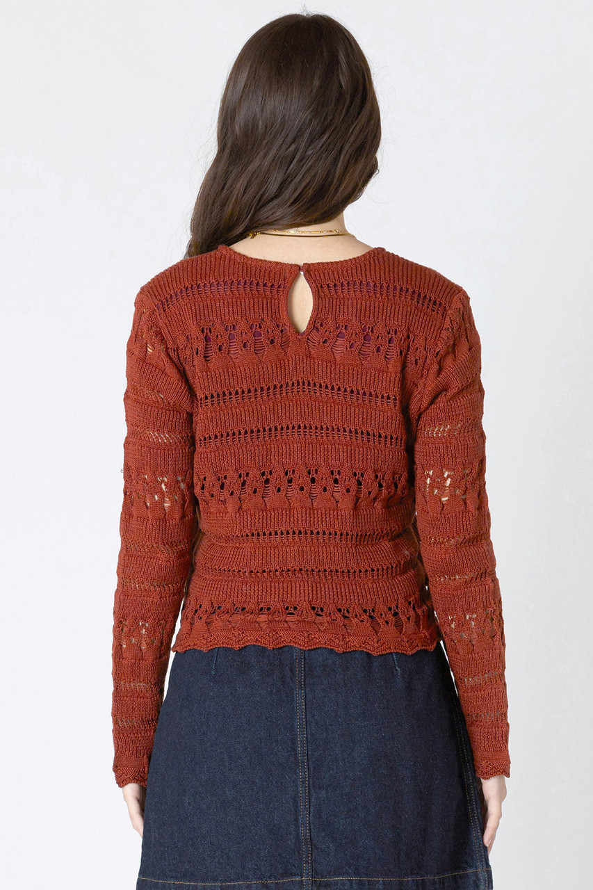 The details in this top are truly stunning. Featuring a crochet knit, all over burnt orange colour, keyhole closure at the back neckline and finished with a scallop hem for added interest. Style this top with a wide leg trouser or denim for a trendy look. By Dex.