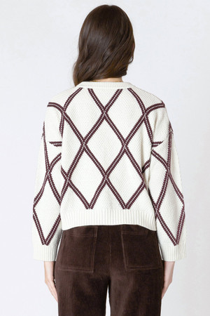 This soft knit sweater by DEX features an all-over diamond check pattern, rich cream and cocoa colours and sits at the waist. A simple way to add texture, pattern and interest. By Dex.Â