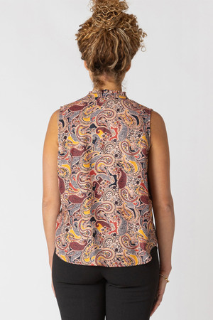 This top is airy, lightweight and has the most beautiful shades of gold, maroon and navy throughout. Featuring a tie front v-neck, gorgeous paisley pattern and a dainty button front. Embrace sophistication with its sleeveless design and elevate your fall wardrobe. By Dex.Â