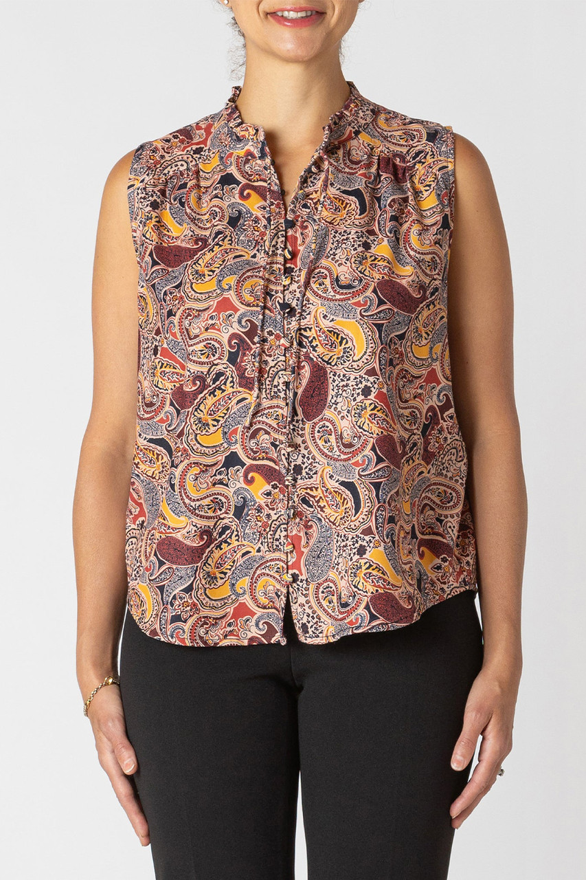 This top is airy, lightweight and has the most beautiful shades of gold, maroon and navy throughout. Featuring a tie front v-neck, gorgeous paisley pattern and a dainty button front. Embrace sophistication with its sleeveless design and elevate your fall wardrobe. By Dex.