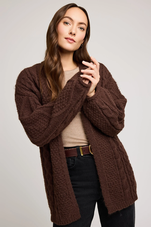 The Betty cardigan is made of a fuzzy yarn with a lofty feel. Features include various cable knit stitch patterns and a rolled sleeve hem detail.