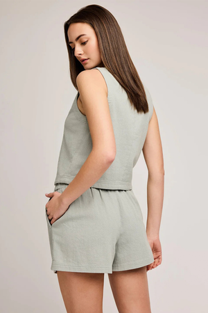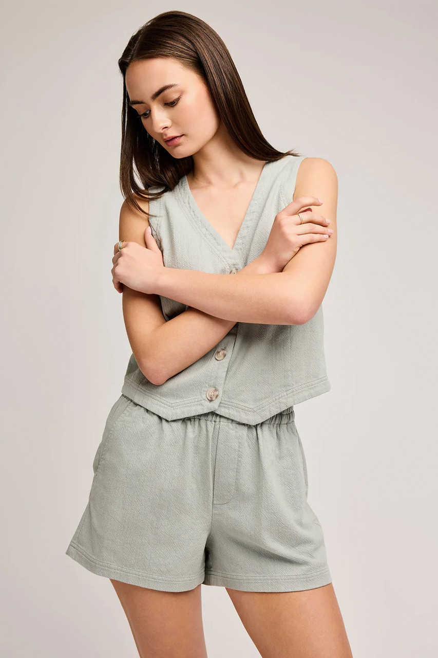 The Cleo short is made of a textured cotton twill that has been specially washed for a soft feel. Features include slash pockets and an elasticated waistband. By Gentle Fawn.Â