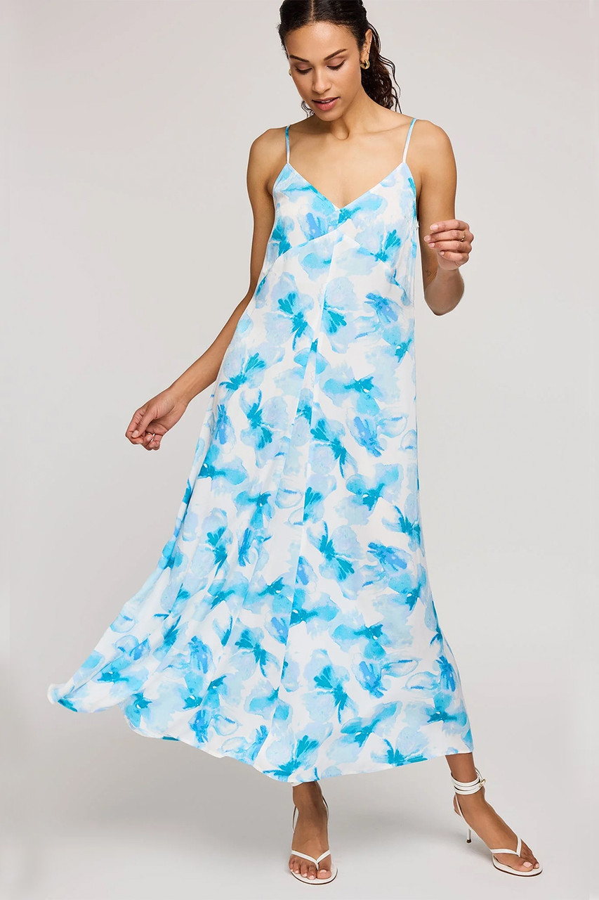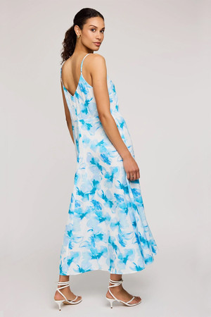 The Cynthia dress is made of a satin fabric with a print designed in-house. Features include a front and back v-neckline and adjustable straps.