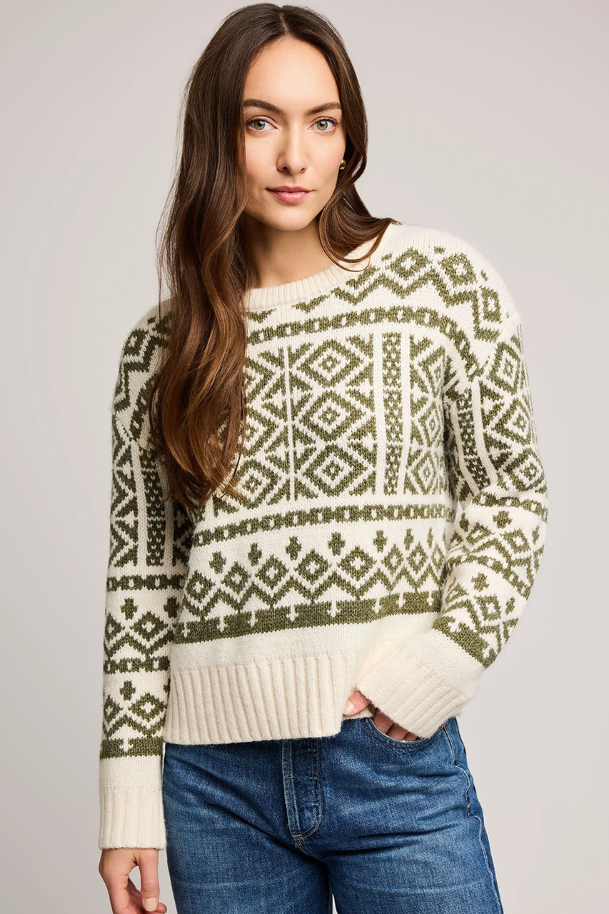 The Cypress sweater is made of a soft yarn with a jacquard knit pattern. Features include a crew neckline and wide ribbed sleeve cuff and hem band. By Gentle Fawn.