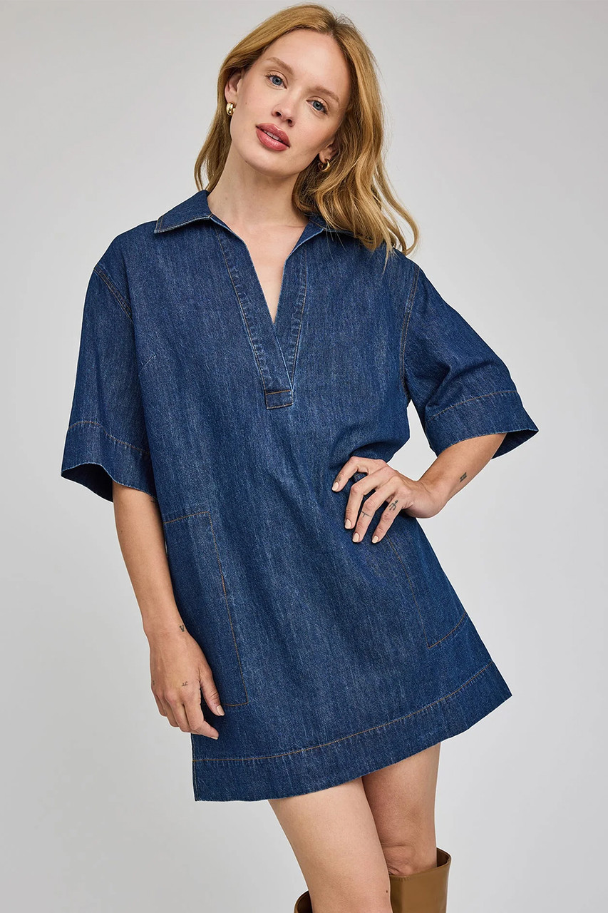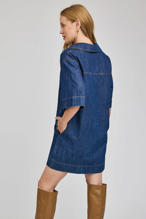The Evelina dress is made of a denim fabric that has been specially washed for a perfectly lived-in look. Features include a collar with a v-neckline and side seam pockets. By Gentle Fawn.Â