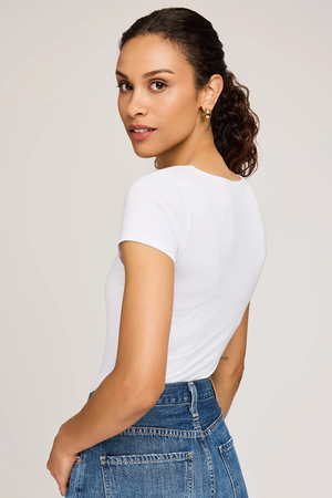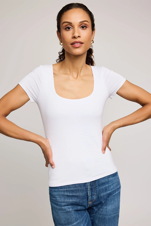 The Fiora t-shirt is made of super soft EcoVero rayon jersey. Features include a square neckline and front body lining for extra coverage. By Gentle Fawn.