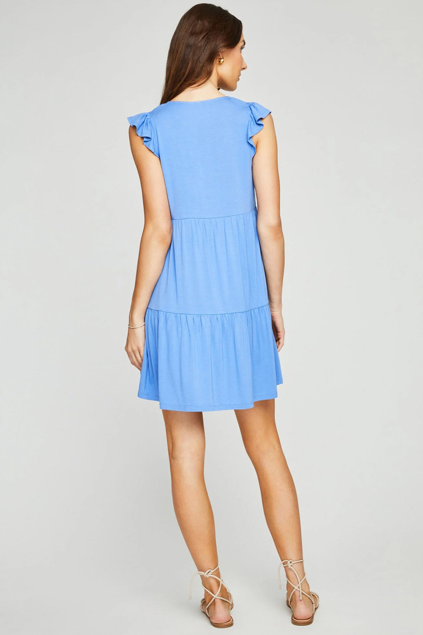 The Joan dress is made of super soft EcoVero rayon jersey. Features include a v-neckline and flutter sleeves for an effortlessly feminine look. By Gentle Fawn.