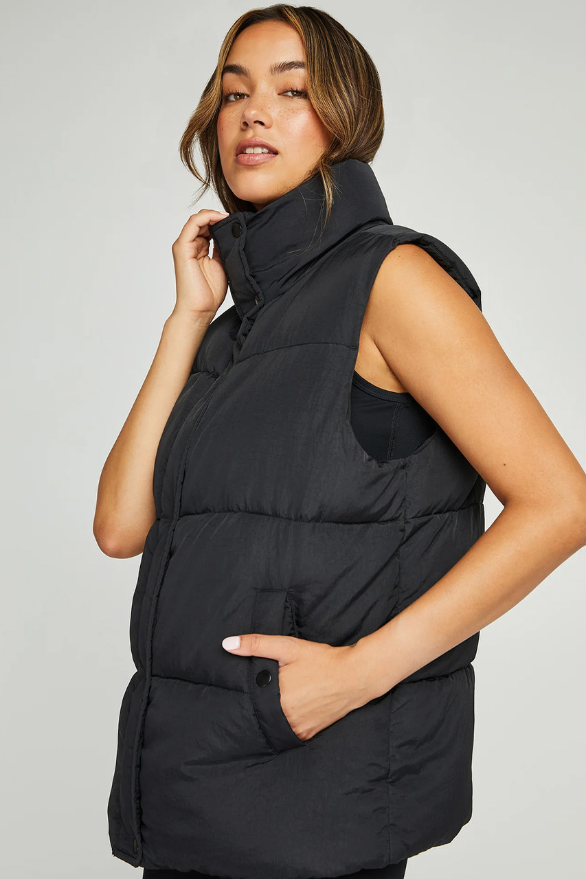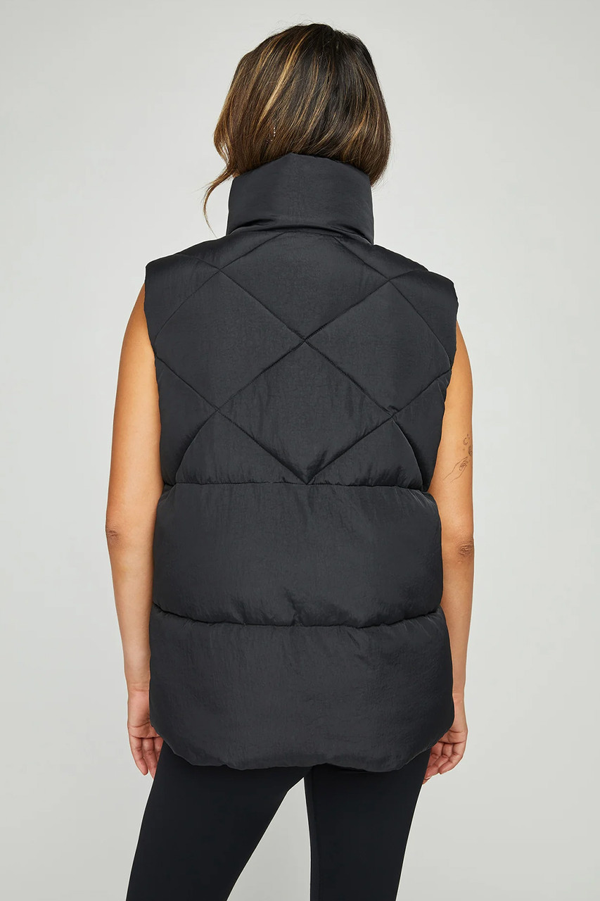 The Kaye vest is made of a water and wind-resistant fabric with 3Mâ„¢ thinsulate featherless insulation. Features include external and internal pockets, an elastic bungee with cordlock, and diamond quilting detail on the back yoke. By Gentle Fawn.Â