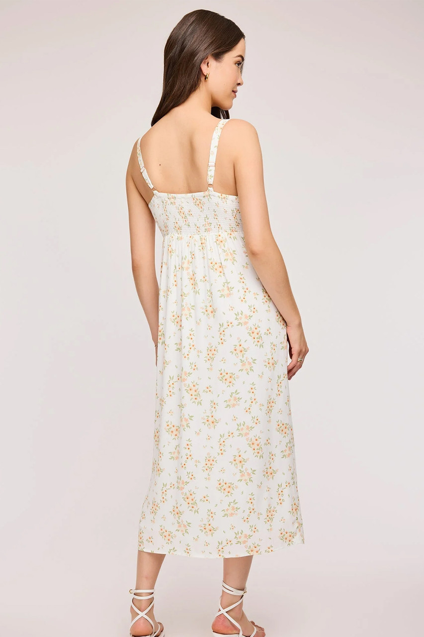 The Lysandra dress is made of a sleek fabric with a print designed in-house. Features include adjustable straps and back smocking panel for ease of wear.