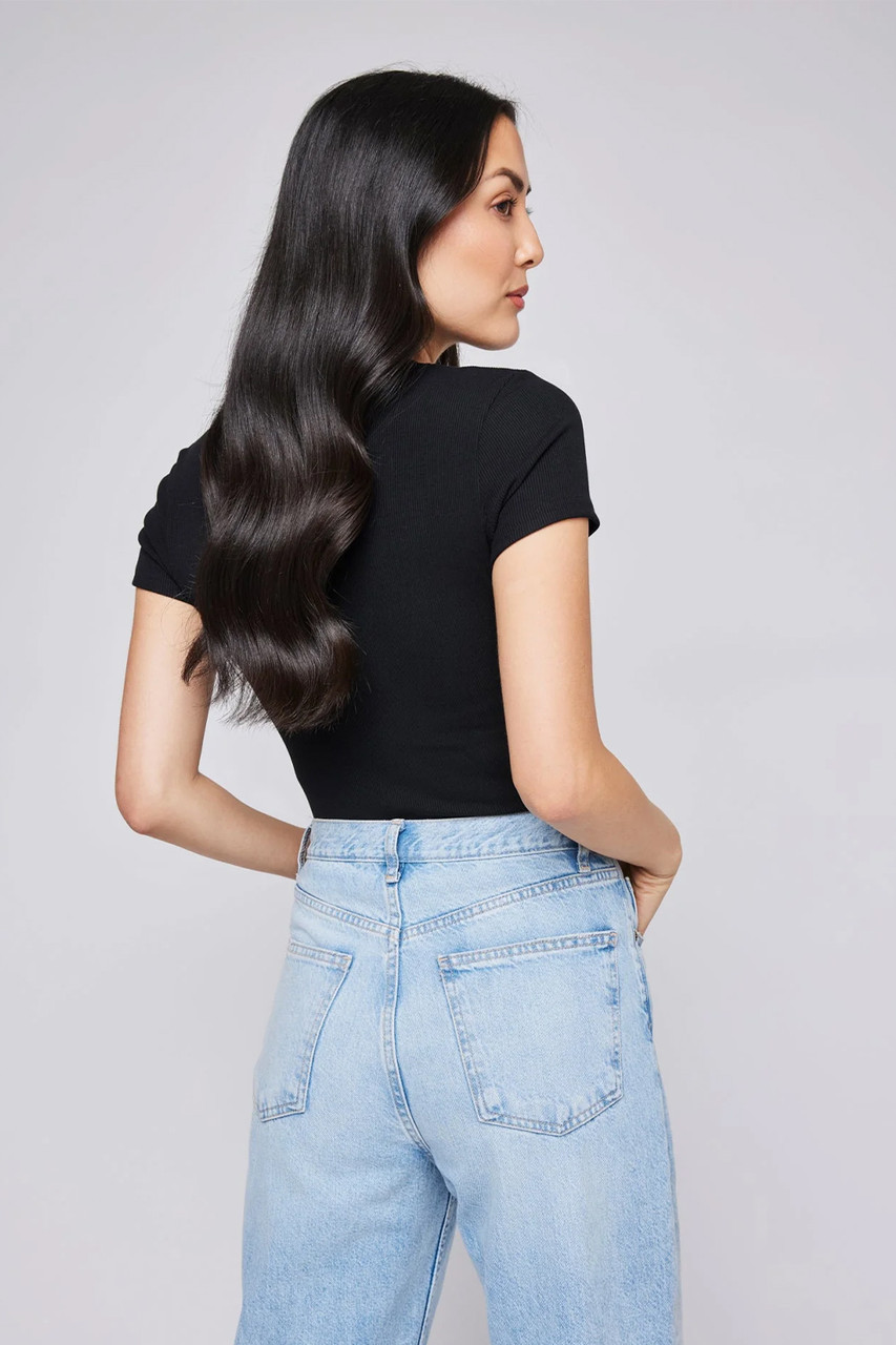 The Madison is a fitted crewneck tee made of a stretchy ribbed fabric that hugs the body. It’s an essential layering piece that can be easily dressed up or down. By Gentle Fawn.Â
