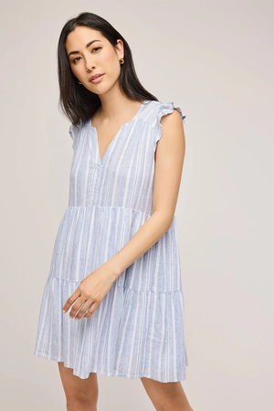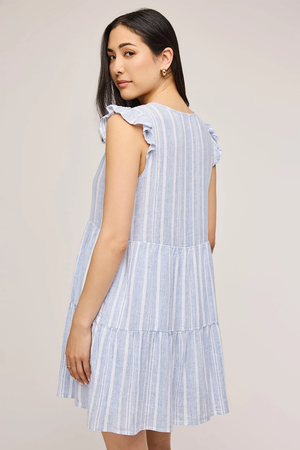 The Maggie dress is made of a lightweight linen blend fabric in a yarn-dyed stripe. Features include inseam pockets and skirt lining for ease of wear. By Gentle Fawn.