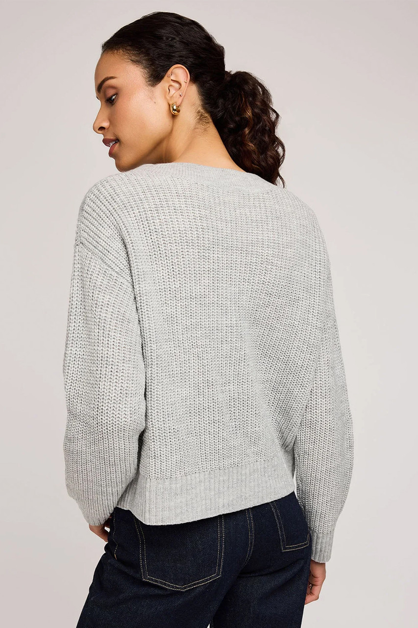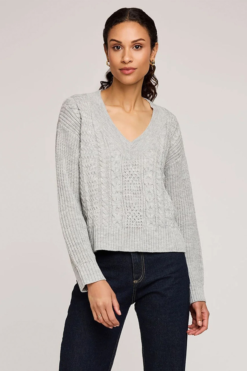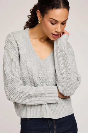 The Marcie sweater is made of a soft yarn. Features include a v-neckline and cable knit details throughout. By Gentle Fawn.