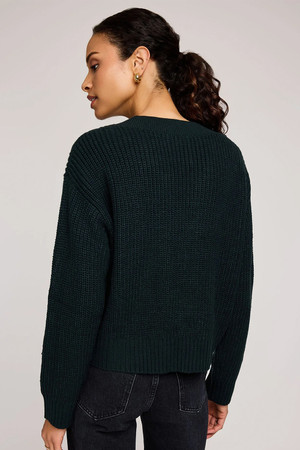 The Marcie sweater is made of a soft yarn. Features include a v-neckline and cable knit details throughout. By Gentle Fawn.