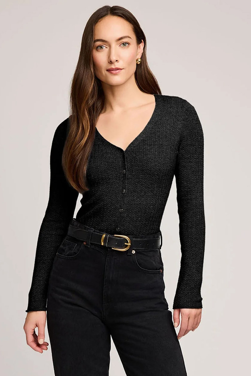 The Mia top is made of a soft yarn in a novelty stitch pattern. Features include a v-neckline and functional button front closure.