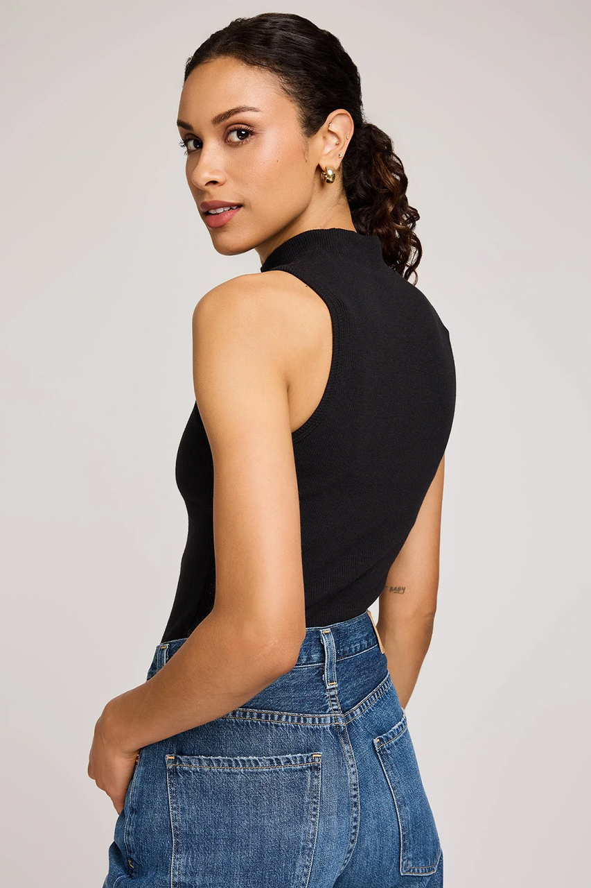 The Michelle tank is made of a mid-weight cotton viscose ribbed fabric. Features include a mock neckline and slightly cropped length for easy layering.