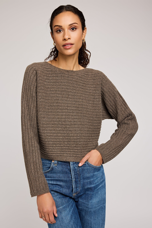The Niko sweater is made of a soft heathered yarn with a horizontal rib knit pattern. Features include a boat neckline and dolman sleeve for an effortless feel. By Gentle Fawn.
