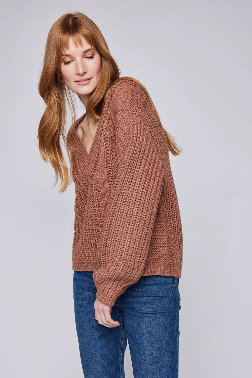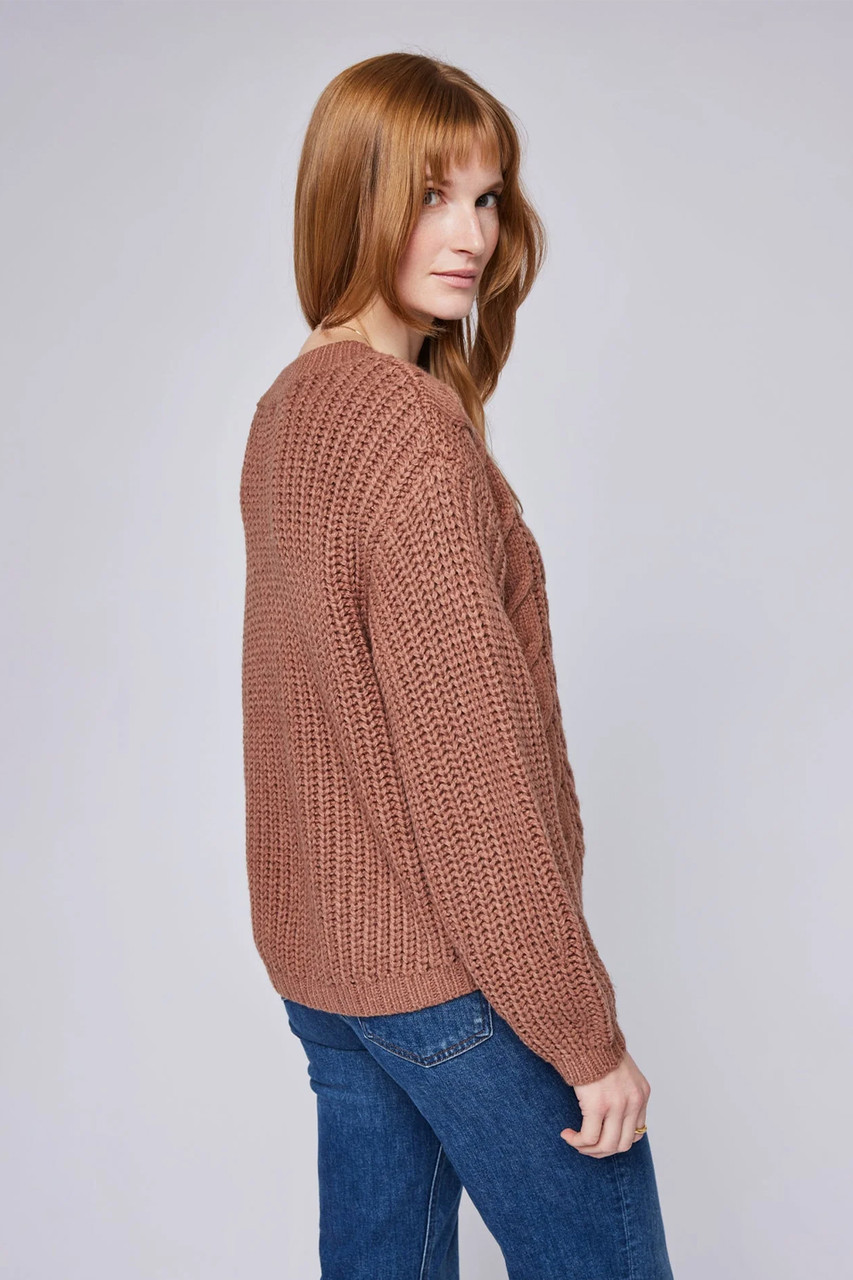 The Octavia sweater is made of a cozy yarn in a half cardigan stitch. Features include a v-neckline and cable knit details throughout. By Gentle Fawn.