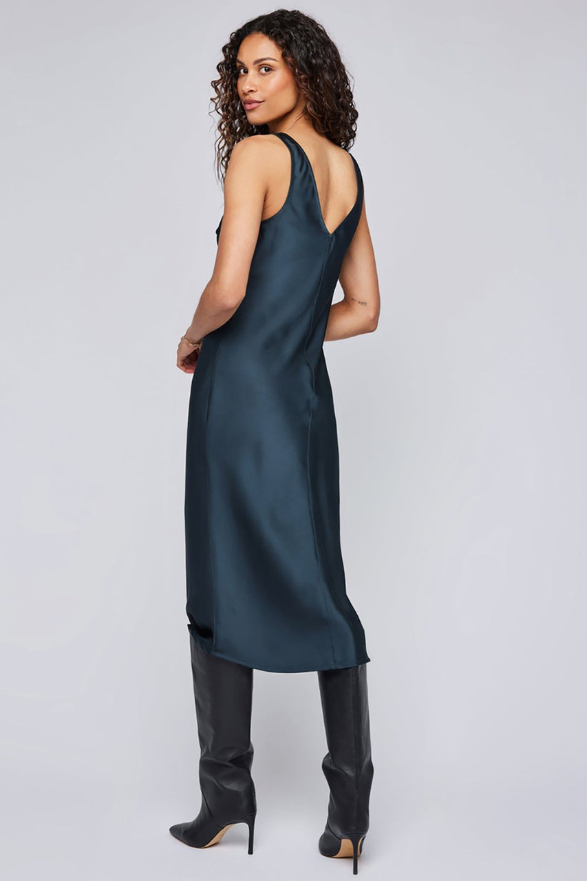 The Odette dress is made of a bias cut satin fabric that drapes perfectly. Features include a flattering front and back v-neckline. By Gentle Fawn.