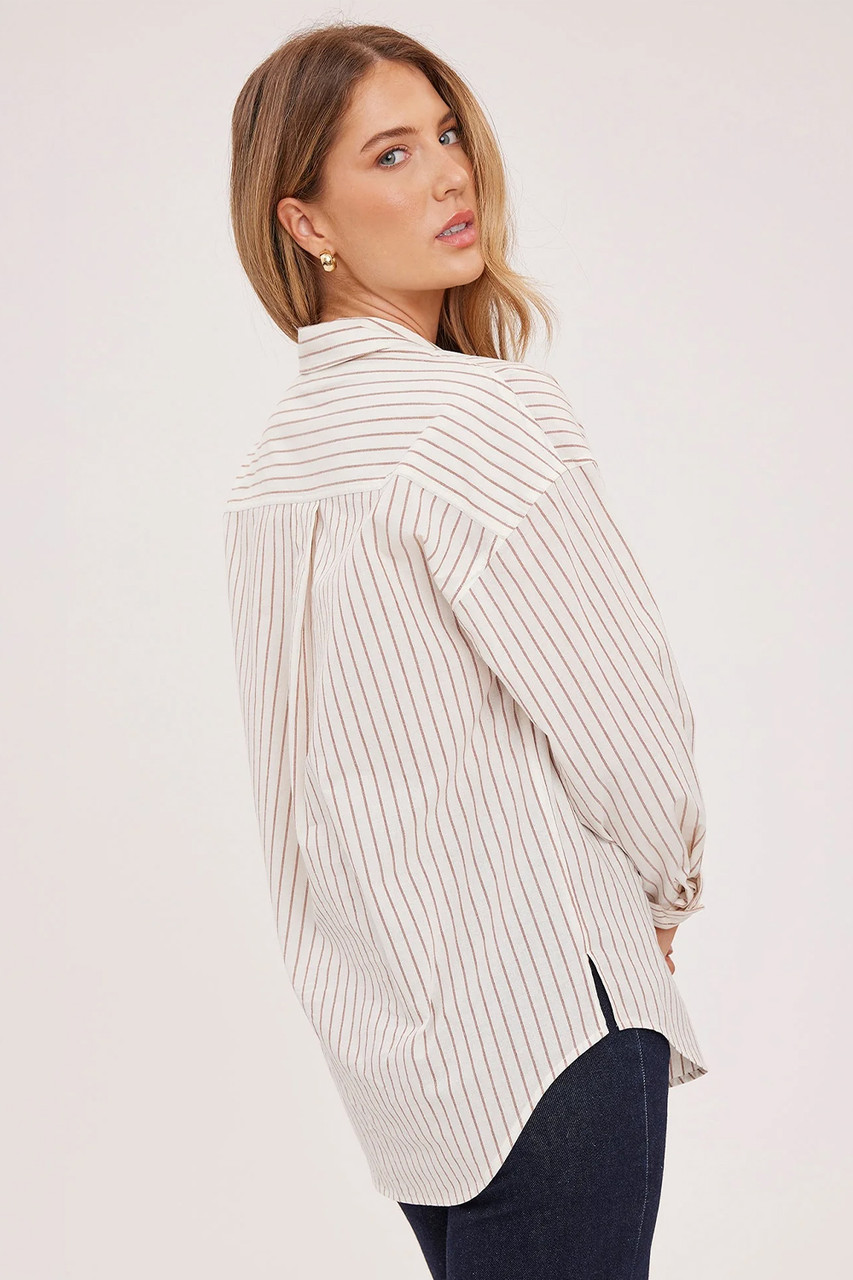 The Orlando button-down shirt is made of a cotton poplin in a yarn-dyed stripe. Features include a patch pocket and side slits. Wear it buttoned up or worn open as a light layering piece. By Gentle Fawn.Â