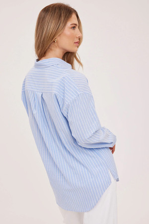 The Orlando button-down shirt is made of a cotton poplin in a yarn-dyed stripe. Features include a patch pocket and side slits. Wear it buttoned up or worn open as a light layering piece. By Gentle Fawn.Â