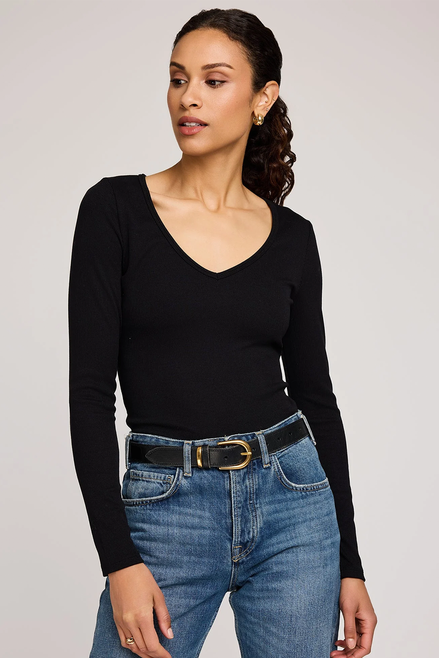 The Petra top is made of a stretchy ribbed fabric that hugs the body. The effortless v-neckline is perfect for everyday wear or dressed up. By Gentle Fawn.