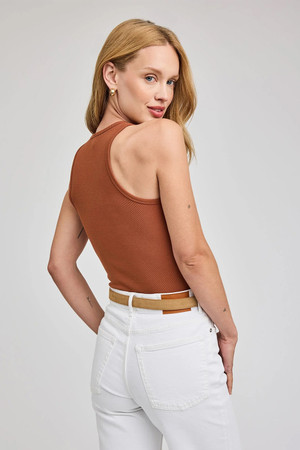 The Ronan tank is made of a stretchy ribbed fabric that hugs the body. The effortless silhouette is perfect for everyday wear. By Gentle Fawn.Â