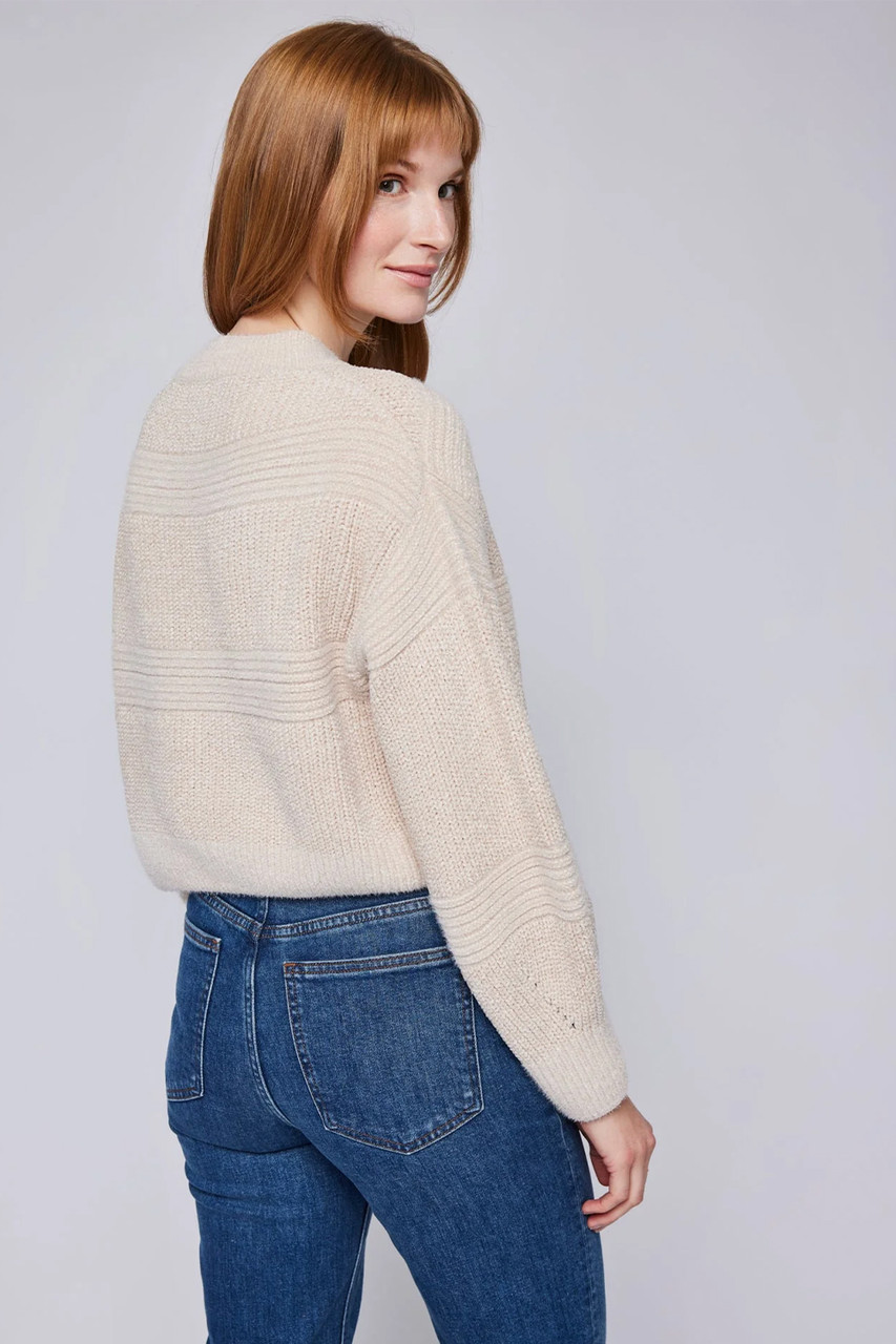The Rosetta sweater is made of a cozy chenille yarn with a subtle lurex thread throughout. Features include a crew neckline and textured stripe knit pattern. By Gentle Fawn.