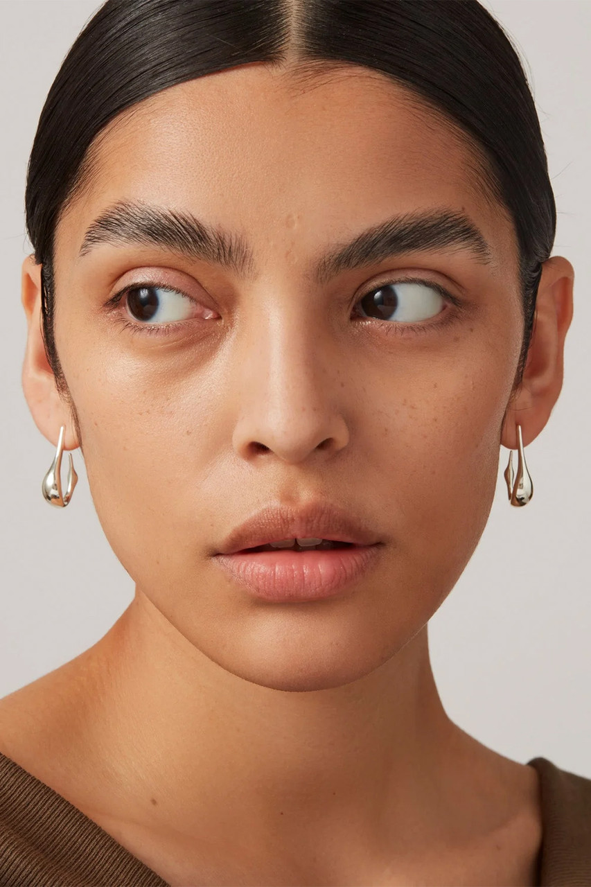 The theatrical beauty of an egret bird is captured in this pair of elevated, small hoop earrings. Finished in high-polish silver. By Jenny Bird.