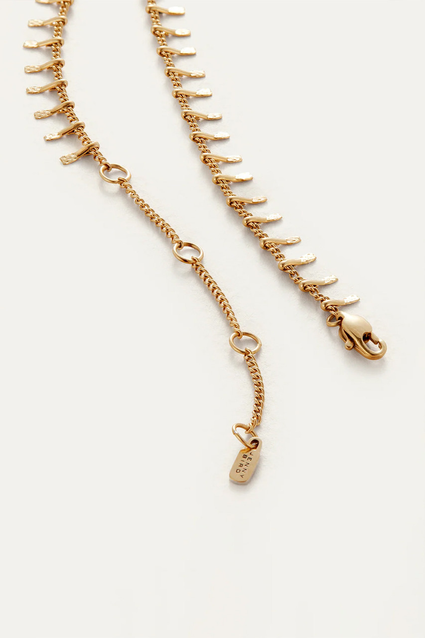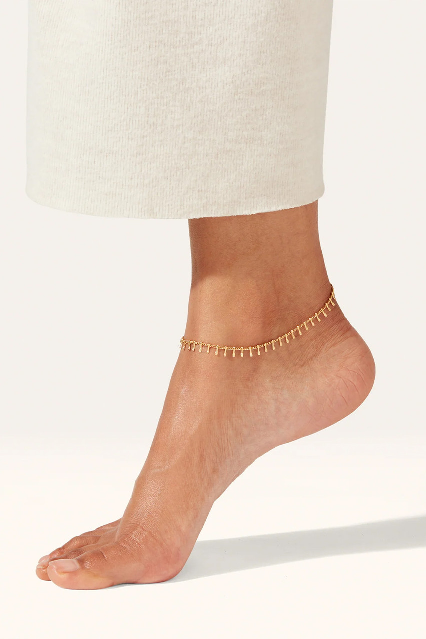 A series of micro stamped elements dangle from a detailed curb chain, catching the light beautifully. The water-resistant Lumi Anklet includes three non-removable extender rings, making it easy to adjust to your ideal length. Finished in high-polish gold. By Jennybird.