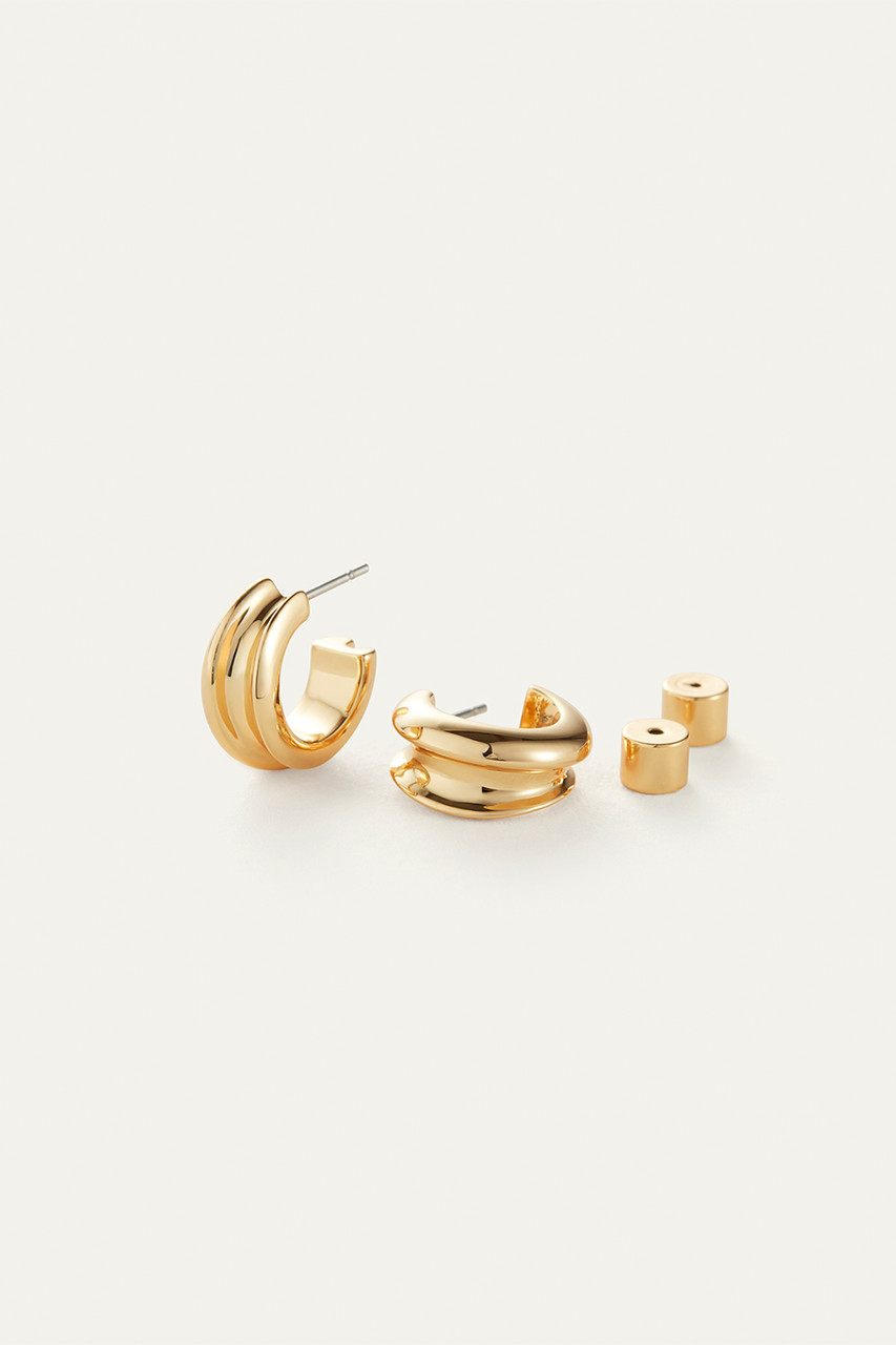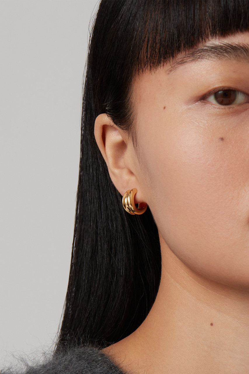These small gold hoop earrings boast deep contours. Finished in high-polish 14k gold. By Jenny Bird.