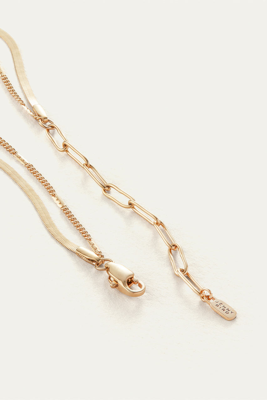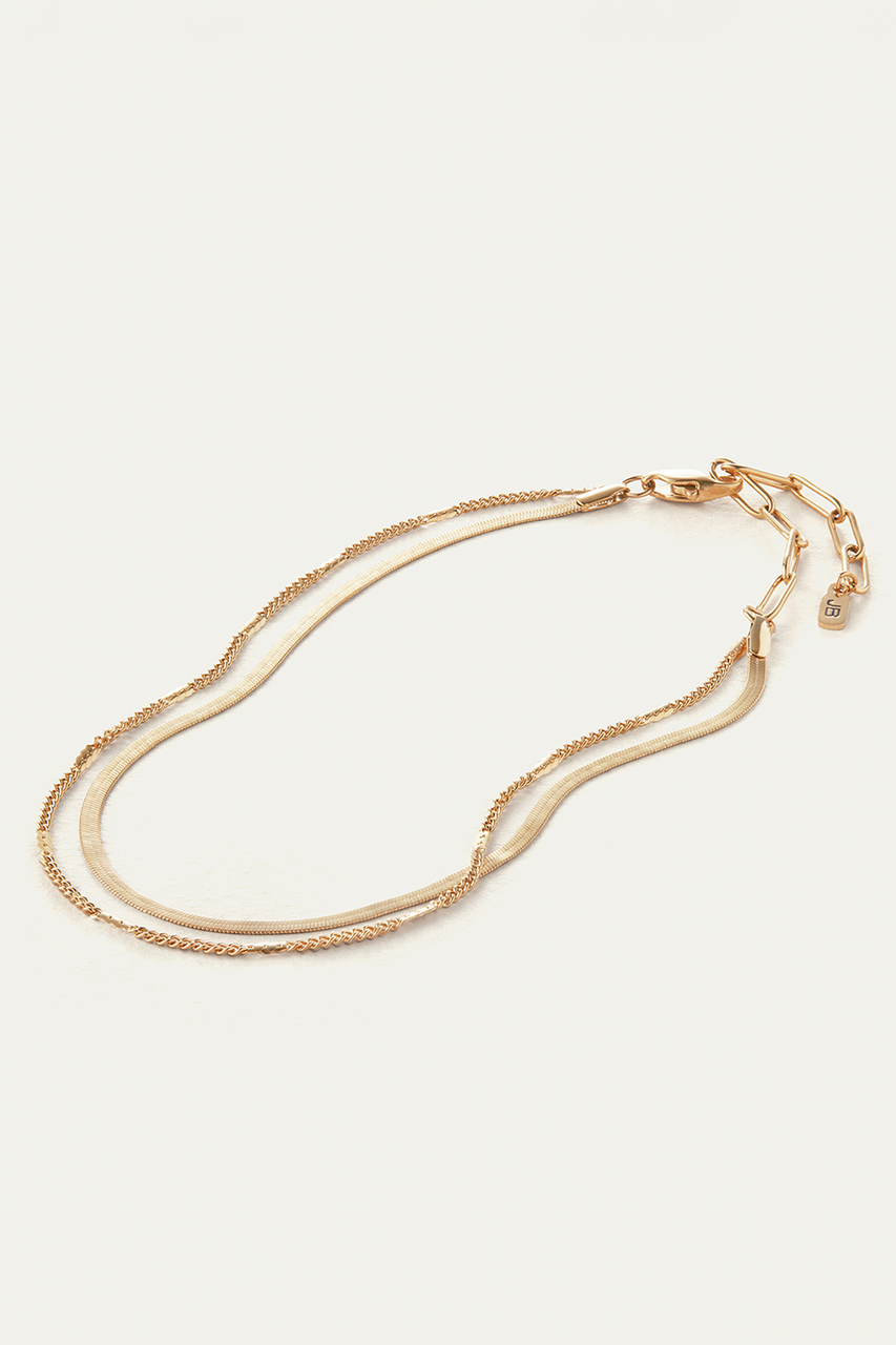 The look of an anklet stack in one easy-to-wear, water-resistant design. The Surfside Anklet boasts a slinky herringbone snake chain and is paired with a stamped curb chain for modern, textural interest. Finished in high-polish gold. By Jenny Bird.