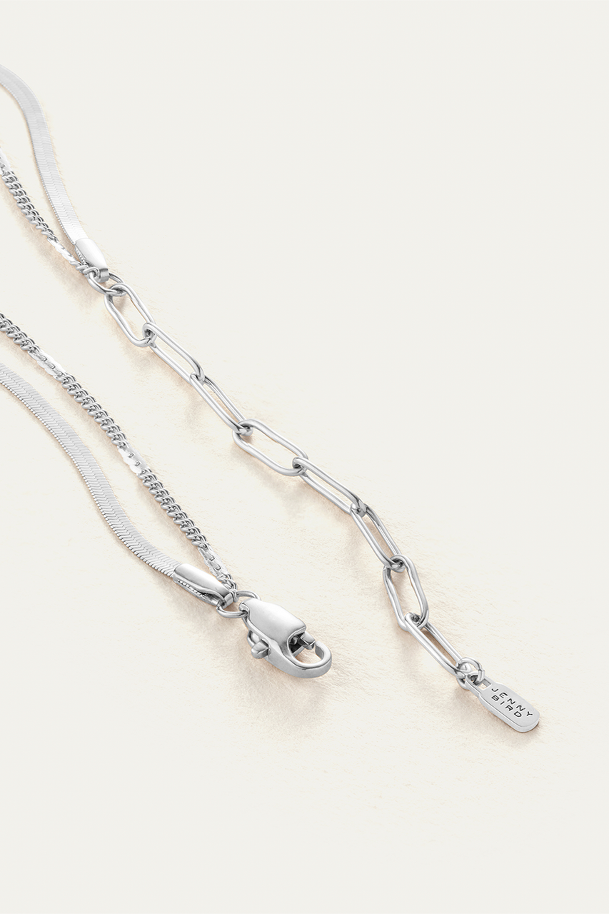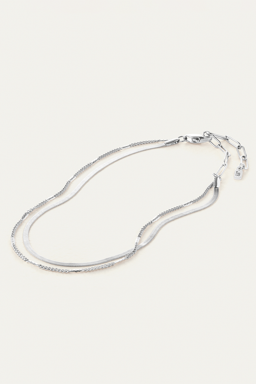 The look of an anklet stack in one easy-to-wear, water-resistant design. The Surfside Anklet boasts a slinky herringbone snake chain and is paired with a stamped curb chain for modern, textural interest. Finished in high-polish silver. By Jenny Bird.
