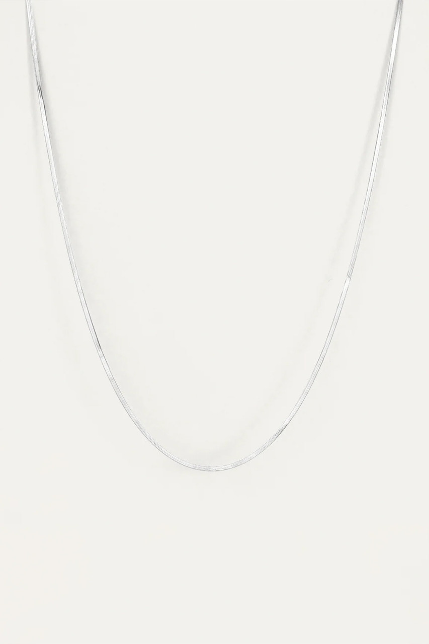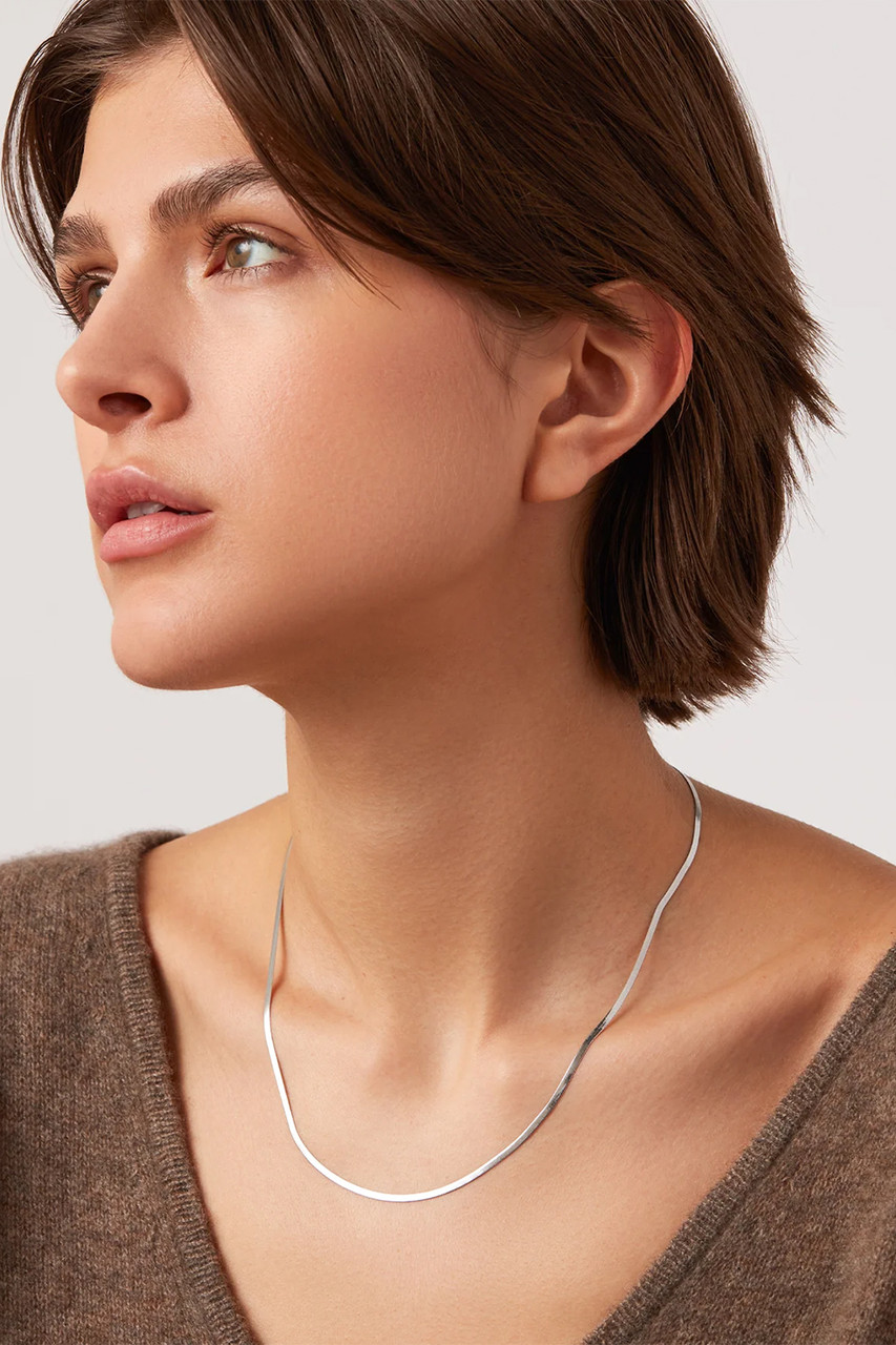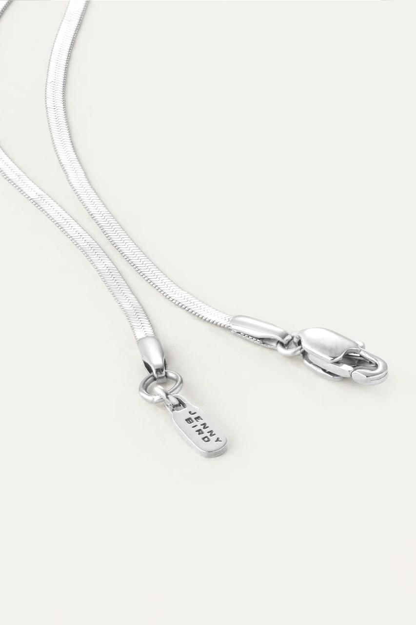 You asked for it in silver, and here it is. The Zeina Slim Chain is a water-resistant design featuring a herringbone snake chain. It lays flush and comfortably against the skin, reflecting light in an eye-catching way. Finished in high-polish silver. By Jennybird.