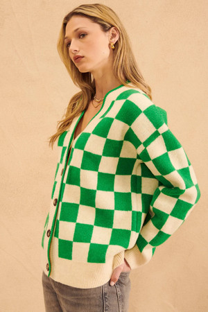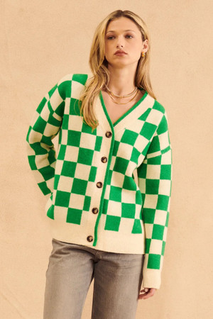 Step out in style with our Lawson Checkered Cardigan – Irish Check! This fun and bold cardigan features a bright green and cream hue, perfect for adding a pop of color to your wardrobe. With its oversized fit and button front, this cardigan is both trendy and versatile. Get ready to turn heads in this playful and stylish piece! By John + Jenn.