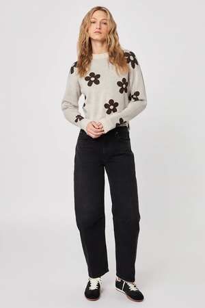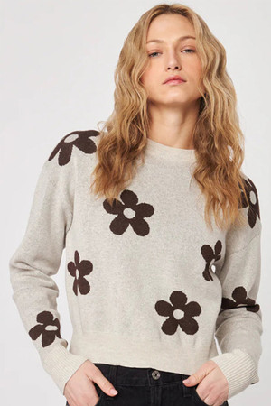 Playful meets cozy in this charming knit sweater, featuring bold black daisy appliqués on a soft heather grey base. Designed with a classic crew neck and a relaxed silhouette, this piece adds a touch of whimsy to your everyday wardrobe. The medium-weight knit offers comfort and warmth without bulk—perfect for layering or wearing solo. By John & Jenn.Â