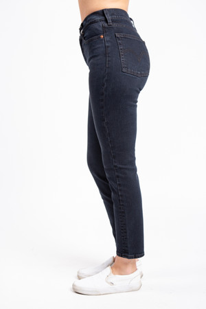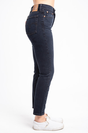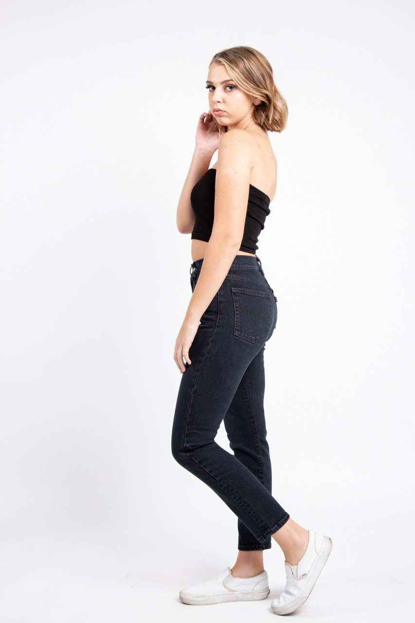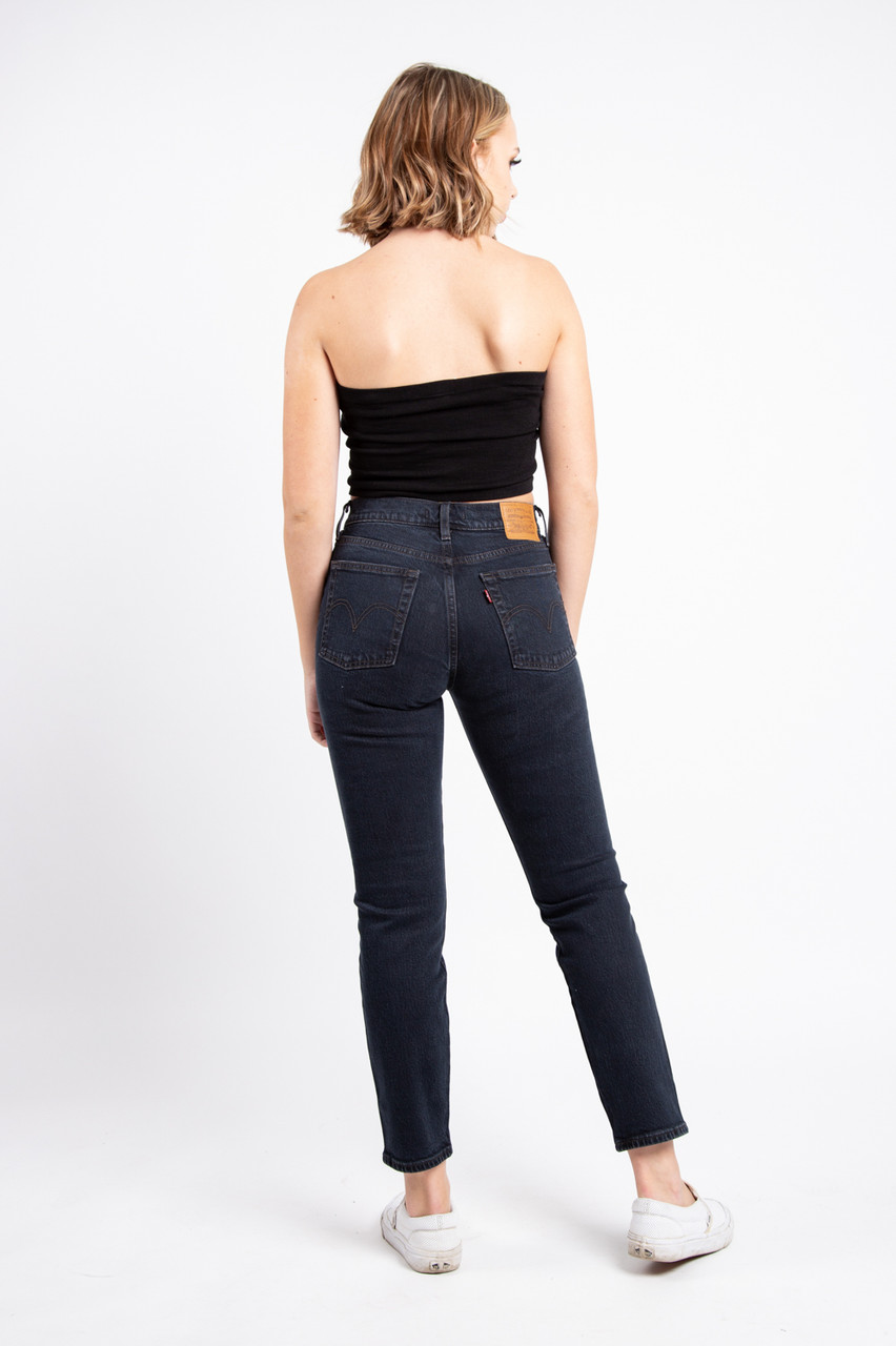 Levi’s high-rise wedgie jean for a cheeky vintage look we love. In a distressed rigid denim with straight-leg fit that’s slightly slouchy through the thigh and tapers in at the ankle. This is a classic denim, with minimal stretch, so we recommend sizing up. Our model here has sized up 2 sizes for a more relaxed fit. By Levi’s.