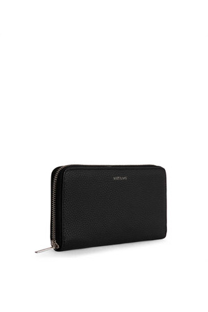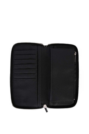 In BlackInterior: 14 card slots, 2 bill compartments, zipper coin pocket.Dimensions: 8” x 4” x 1”