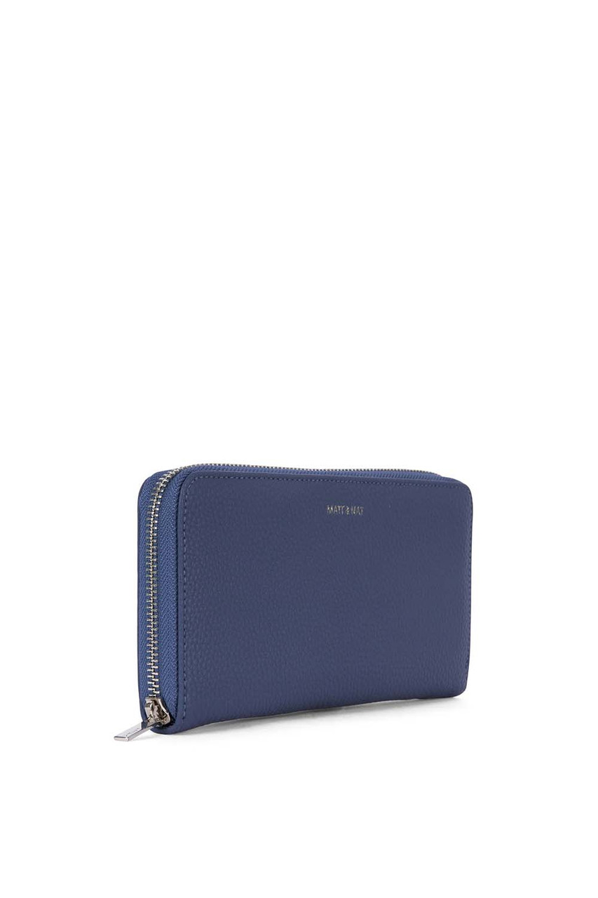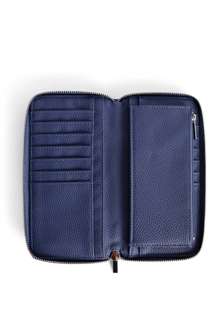 In BlueberryInterior: 14 card slots, 2 bill compartments, zipper coin pocket.Dimensions: 8” x 4” x 1”