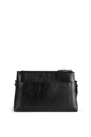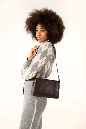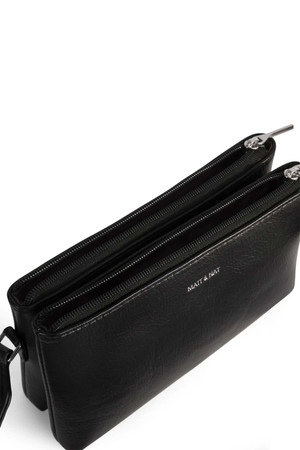 A double-compartment bag with zippered closures, a patch pocket at exterior back which can hold a large smartphone, 6 credit card slots at interior, and an adjustable strap. By Matt & Nat.