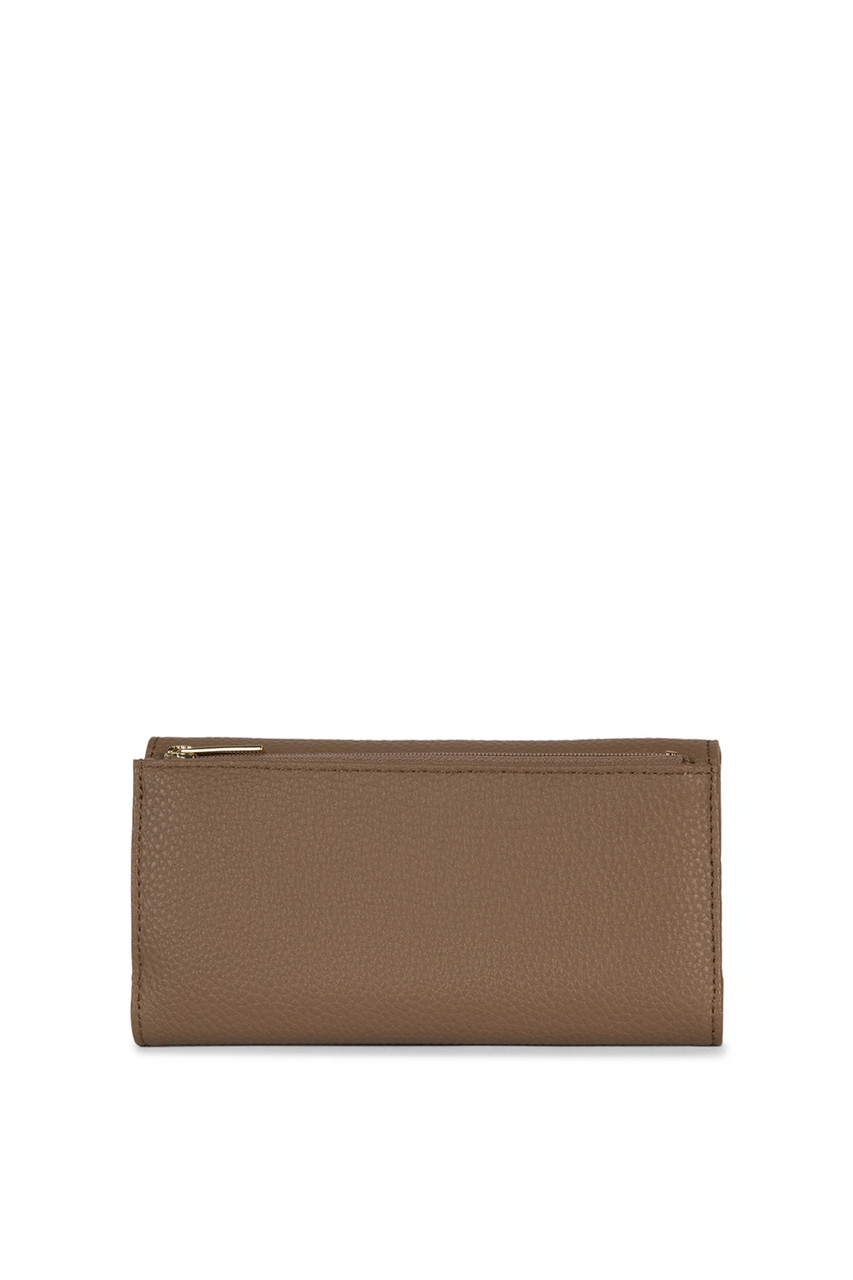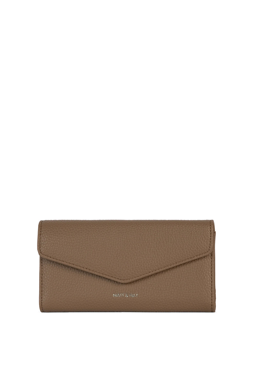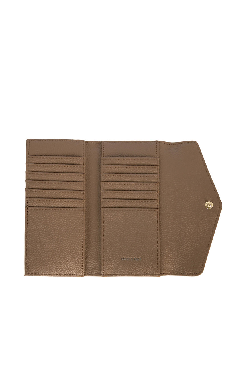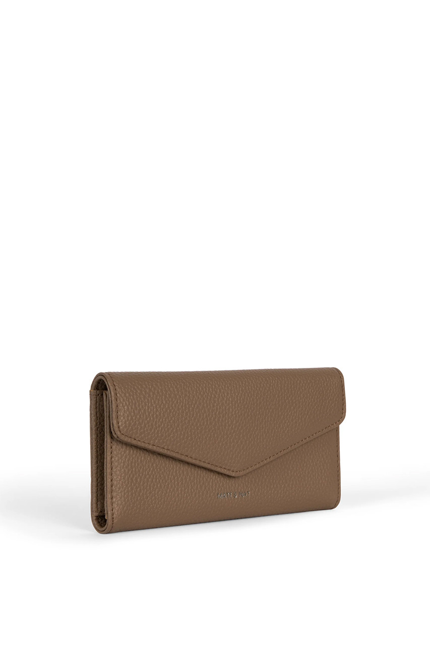 Folded wallet with a flap closure and a zipper pocket at the back. By Matt & Nat.
