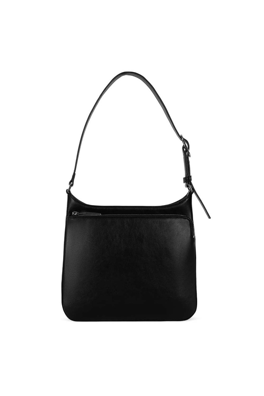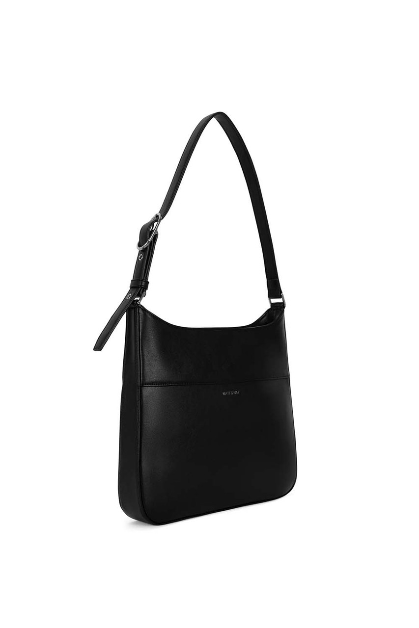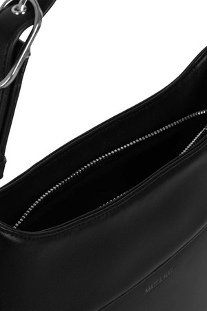 Slim shoulder bag with a top zipper closure, a zipper pocket at the exterior back, and an adjustable buckle strap. By Matt & Nat.