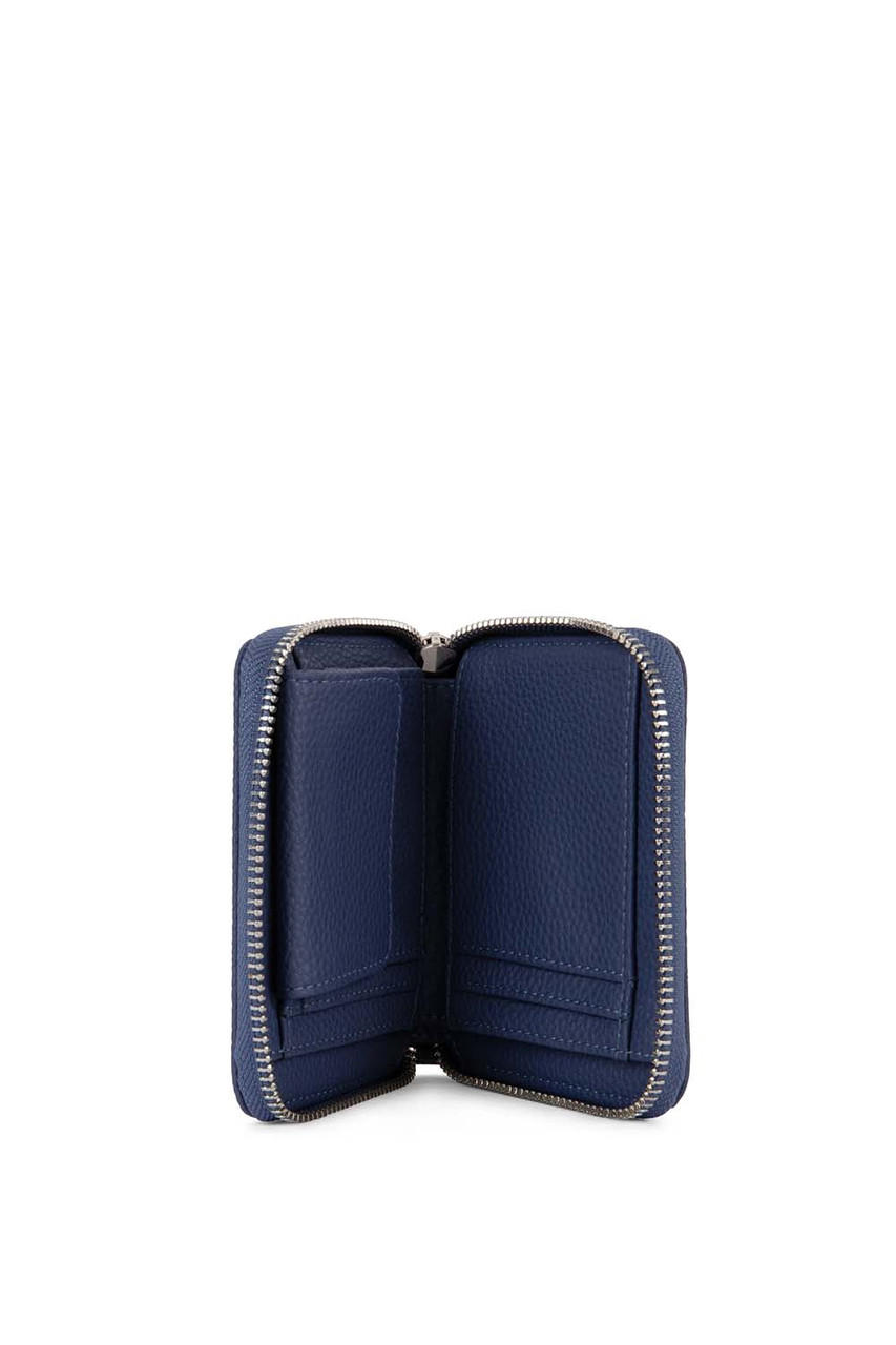 In BlueberryInterior: 1 bill slot, coin pocket with flap, and 5 card slots.Dimensions: 4.5” L x 4” H x 0.8” D.