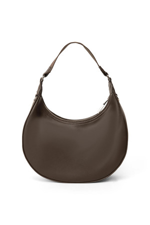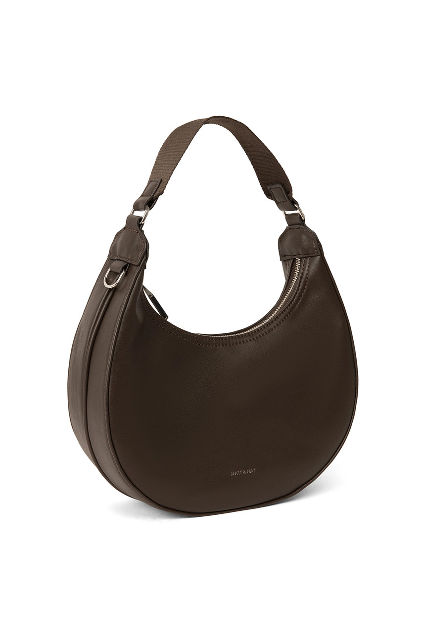 Crescent-shaped hobo bag with a top zipper closure and fixed-length handle. It comes with a detachable and adjustable webbing strap to wear across the body or on the shoulder. By Matt & Nat.